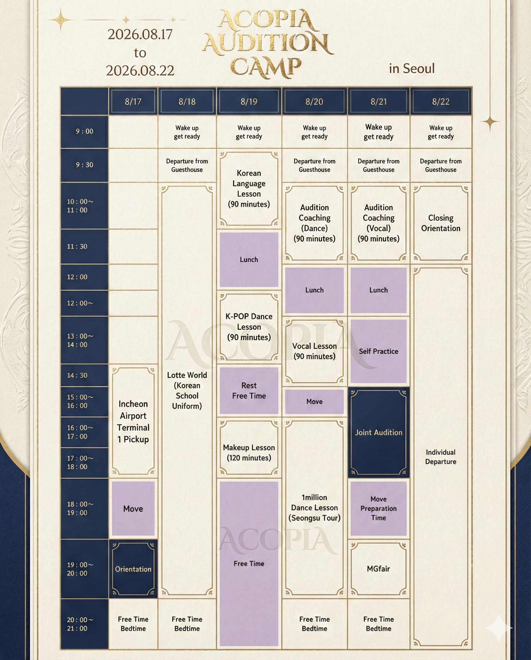 learn Korean, enjoy authentic cuisine, and connect with K-POP fans. Audition and experience the full process. Also, explore vibrant Seoul!