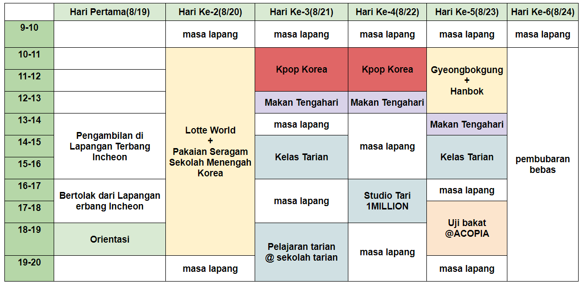 Kos termasuk penginapan, kelas tarian K-POP, kelas Korea, makan tengah hari, lawatan bandar pilihan dan pengambilan dari lapangan terbang. Kos TIDAK termasuk tambang penerbangan ke Korea dan dari Korea Selatan, bayaran pemindahan lapangan terbang ke Hongdae, perbelanjaan peribadi di luar jadual perjalanan kem, sarapan pagi, makan malam dan insurans perjalanan.
