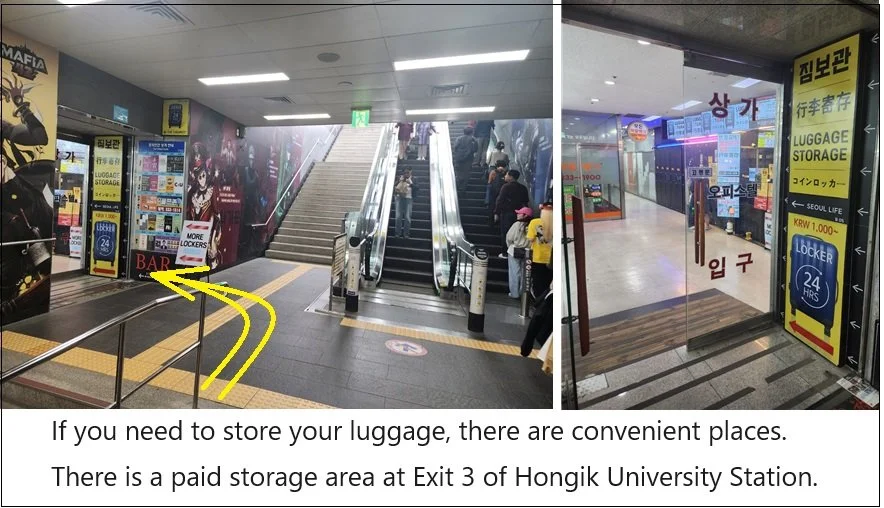 If you need to store your luggage, there are convenient places. There is a paid storage area at Exit 3 of Hongik University Station.